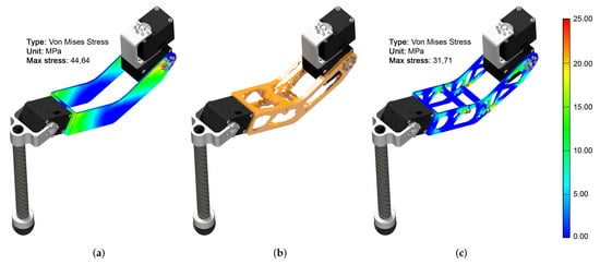 The sheet metal femur segment before topology optimisation (a), the material mass plot from the topology optimisation analysis that indicates material that can be removed and the optimal placement of strengthening PCB spacers (b) and the result after topological optimisation (c). The colour bar’s range is set to 25 MPa to better highlight the stresses. The optimisation not only decreased the segment’s mass from 59 to 44 g (25.4%) but also lowered the maximum stress level from 44.64 to 31.71 MPa (29.0%) when lifting a 2.0 kg payload.