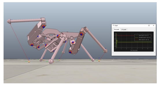 Finally, the simulation software CoppeliaSim (version 5.9.0) by Coppelia Robotics was used to simulate the completed design and investigate if the motors were capable of lifting and moving the robot (Figure 8). One of CoppeliaSim’s integrated inverse kinematics-based control algorithms was used to control the legs in a mid-swing static tripod stance (Figure 8). The tripod stance’s three standing and three lifted legs reaches predefined points for the end-effectors, where the TC-, CTF-, and FT-joint angles are calculated with inverse kinematics. The worst-case scenario is the mid-swing phase of a tripod gait, as only the hind and front leg of one side and the middle leg of the opposite side are touching the ground. The motors of the standing middle leg are heavily loaded, as they need to support the mass of the lifted hind and front leg, as well as approximately half of the body mass. The simulated tripod stance showed that the maximum motor torques were below the stall torque of the XM430-W350-T motors. Hence, the robot design was approved, and the development and manufacturing of the prototype ALPHA could be started.