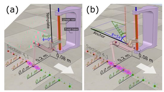 The legs’ origin point was positioned 0.08 m above-ground and held in place by a vertical linear rail (Figure 9). Each leg was loaded with 2.0 kg, which is similar to the worst-case scenario described in Section 5.2. The performances of the anchor’s hind and mid legs may be approximated from the front legs’ results, as the legs have the same joint distances, similar mass, and a mirrored angulation (Table 1 and Figure 5).