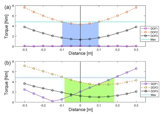 In addition, the anchor morphology’s improved torque distribution enables 95.5% greater reach, by utilizing a greater amount of its forward work envelope (79.6%) than the template morphology (45.8%) (Figure 12). The template morphology was able to reach the highest point of 0.36 m. However, it is prevented from practically using this isolated position, as the DOF2 motor will be overloaded as soon as the leg starts to pull downwards from the position, thereby moving the leg in a forward curve (0.24 m and beyond). The positions throughout this curve will overload the DOF2 motor, as the end-effector reaches too far from the origin point. It can be considered that the load on the front legs might be reduced in some positions and angles of the hexapod body, which can enable greater reach. However, the anchor morphology still has a greater reach in those positions. Hence, the anchor morphology with its improved dexterity can better utilize its workspace and overcome obstacles than a template morphology.