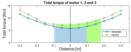 The template morphology can perform steps of 0.18 m before being overloaded, while the anchor morphology can perform steps of 0.27 m (Figure 9-pink line and Figure 10-filled area). Hence, the anchor morphology is capable of performing 50.0% longer steps. Meanwhile, this causes a higher total torque output for the anchor morphology (Figure 11) and, thereby, a higher power consumption.