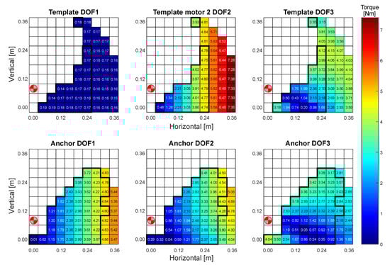 It is found that the anchor morphology has a better reach in both the proximal and distal direction, as well as a generally higher reach (0.28 m). The template morphology was limited by the motor connected to the second-degree-of-freedom (DOF2), which was disproportionately more heavily loaded than the other motors. Meanwhile, the motor for DOF1 remains nearly unloaded. While the template morphology can reach the highest isolated point (0.36 m), this reach is then practically unusable as the point is unconnected with the remaining usable manipulation area. The template morphology was able to use 22 of its 48 reachable positions (45.8%), while the anchor was able to use 43 of its 54 reachable positions (79.6%), which provides the anchor with 95.5% broader usable reach.