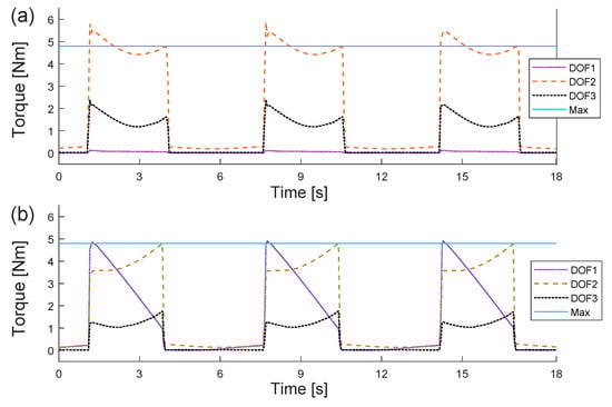 The motors’ torque during gait cycles for both (a) template and (b) anchor morphology.