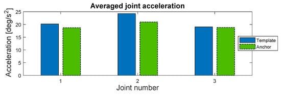 Subsequently, the step dynamics were analysed relative to their maximum range (Figure 10-filled area). The anchor morphology’s longer step length results in a 21.1% lower stepping frequency (0.15 Hz) than the template model (0.19 Hz). When averaging each legs’ total motor acceleration over 50 s, it was found that the motors of the anchor morphology had a 7.9% lower general acceleration than the template morphology; where the DOF1 motor was 7.3% lower, the DOF2 motor was 13.6% lower, and the DOF3 motor was 1.3% lower (Figure 14). The lower torque impulses and acceleration level helps decrease fatigue and increase motor life.