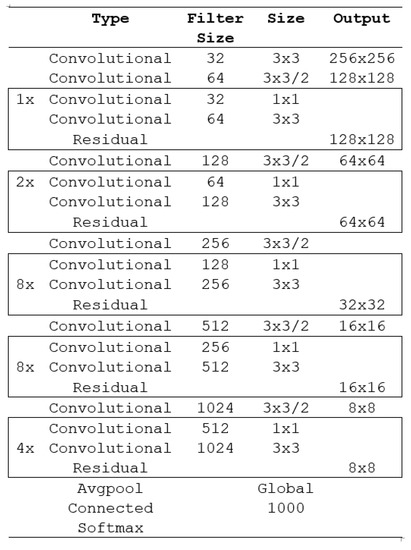 Yolo V3 consists of 53 layers with deep characteristics and was built on Darknet-53. Yolo V3 has demonstrated better than ResNet-101, ResNet-152, or Darknet-19 [33]. Figure 1 exhibits the construction of Darknet-53. The input image is divided by the Yolo V3 algorithm into S×S grids. If the central point of the ground reality of the object decreases within the required grid, the grid can define the target. Each grid outputs B bounding prediction boxes, including bounding box location data that consist of coordinates of the middle point (x, y), width (w), height (h), and confidence prediction.