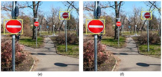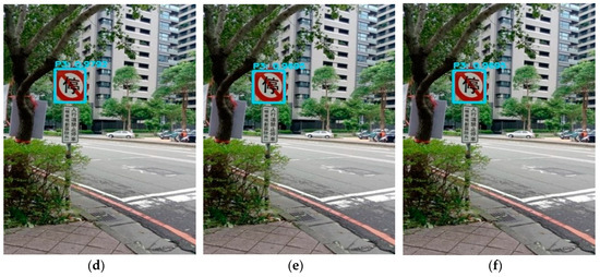 Recognition test for prohibitory sign class P3 by (a) Yolo V3 1, (b) Yolo V3 2, (c) Yolo V3 3, (d) Yolo V3 SPP 1, (e) Yolo V3 SPP 2, and (f) Yolo V3 SPP 3.