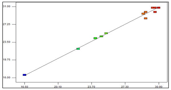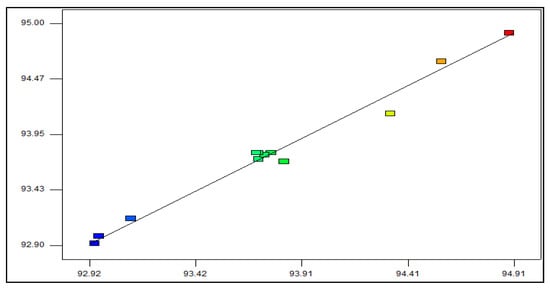 This study shows that the models of the coefficients of determination were 98.20% for ABTS radical activity and 99.06% for phenolic content, which present the maximum degree of correlation between the observed and predicted values. Moreover, the high value of the adjusted R2 (96.04% and 97.93%) also indicates a significant correlation between the experimental and predicted runs by the software. These results can be explained by a similar study by Yolmeh et al. [] where the model was considered accurate when R2 was close to one. Figure 2 and Figure 3 show a linear curve for the experimental values in terms of the predicted ones. Next, the fitness of the models was also studied through a lack of fit test, where the values for all responses were not significant (p-value > 0.05), which showed the suitability of models selected to predict the responses [].