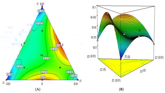 The simultaneous optimization mixture formulations were determined from the overall desirability function and graphical analysis of the response surface (contour plot) from adjusted models []. The models were finally validated by performing the real experiments on each optimal point mixture.