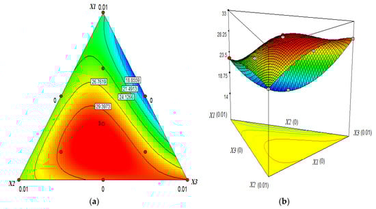 Simultaneously, the response surface for the phenolic content activity of the Melastoma leaf mixture extract is shown in Figure 5. The mixture contour plots in Figure 5a,b show that the phenolic content activity also increased with the addition of the x3 component to both interactions of mixtures x1 and x2 components. From this result, the highest interaction between the mixtures can be seen from the coefficients of x1x3 and x1x2x3 where the greater F-values of both coefficients yielded 140.51 and 150.81, respectively, in Table 4. This result can be justified using the study of antimicrobial efficacy of essential oils by Quedrhiri et al. [] where different compounds can interact to either reduce or increase the response outcomes. On the other hand, in terms of ABTS radical activity, the component x1 had a slight effect on the interaction of both x2 and x3 components, where the synergistic effect was found between the mixtures of x1 and x3, while antagonistic effects were found in the mixture of x1 and x2. Meanwhile, for the phenolic content activity of the mixture of Melastoma extracts, the component x3 showed a significant synergistic effect on either x1 or x2 coefficients. Therefore, it can be seen that the interaction between the three Melastoma leaf extracts resulted in a significant effect on the scavenging activity of radical species and on the phenolic content activity.