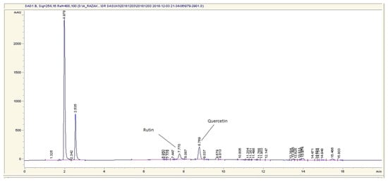 HPLC chromatograms of flavonoid constituents (quercetin and rutin) of all the samples and standards were separated within 18 min and showed good resolution between the matrix and analyte peaks recorded at 254 nm, as shown in Figure 6. From the observations, there were four peaks in the chromatogram of the optimized mixtures of Melastoma extract. The first and second peaks were excluded in this study, which belongs to solvent and unknown peaks. Meanwhile, the third and fourth peaks were identified and confirmed from significant antioxidant constituents. In this analysis, both rutin and quercetin were identified in the mixture of Melastoma leaf extract. The retention times of the mixture of Melastoma leaf extracts were 7.770 min for rutin and 8.769 min for quercetin (Table 6). They were confirmed and identified by comparing the retention time with two reference standard compounds from the standard response, such as in rutin (RT = 7.024 min) and quercetin (RT = 8.741 min) in Table 7. On the other hand, it can be seen that the retention of rutin was shorter than quercetin. Wu et al. [] also found the same elution order in the chromatogram of rutin and quercetin obtained with an high performance liquid chromatography- ultraviolet (HPLC-UV) detector from a sample extract of Flos Sophorae Immaturus. The differences in retention time are mainly due to the role of flavonoid constituents of their differences in chemical structure and chemical variation, such as hydroxylation, methoxylation, the type of conjugation (glycosylation, sulfonation, malonylation), and the degree of polymerization []. Meanwhile, the HPLC-UV peak area of rutin and quercetin shows that quercetin exhibits the largest quantity mass fraction (1498.90 mAU) as compared to rutin, which was 391.7 mAU. Saraf and Sankhla [] also found that the amount of quercetin is large compared to rutin in the methanolic extract of Tecomella undulata.