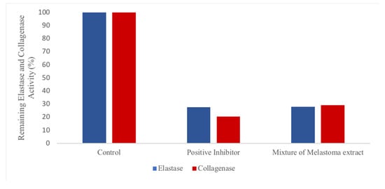 The percentage of remaining elastase and collagenase activity for a mixture of Melastoma extracts.