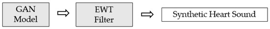 The proposed method is made up of two main stages, as shown in Figure 3. The first stage consists of the implementation of a GAN architecture to generate a synthetic heart sound, and the second stage is in charge of reducing the noise of the synthetic signal using an empirical wavelet transform (EWT). This last stage consists of a post-processing applied to the signal generated by the GAN, in order to attenuate the noise level. Therefore, it makes it possible to reduce the number of epochs (and consequently the computational cost) required to train the GAN until obtaining a low-noise output signal.