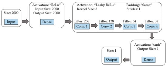 Figure 6. Architecture of the discriminator model. - Dataset of heart sounds: 100 normal heart sounds obtained from the Physionet database [30] were used, with a sampling frequency of 2 KHz and 1 s of duration. For this dataset, those signals with a similar heart rate were selected—that is, all signals have a similar systolic and diastolic interval duration;