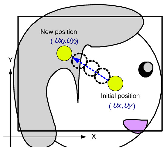 The user had to move along a specific path, according to the coordinates indicated by the system, to confirm that the system had retrieved the feature object. If not, the system must return to the initial setting to retrieve the feature object again. According to the head direction judgment rule of this study, the skin color barycenter point of the front-side image was taken as the datum point [