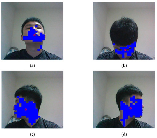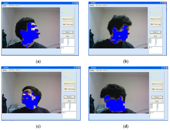 y of the barycenter coordinates of the image after its movement. When the head was raised or lowered, due to light reflection, many pixels belonging to the face were unrecognized as skin, so the system must have had a fault-tolerant design. After the above-mentioned judgment of head direction, the system was able to judge the upward, downward, leftward, and rightward movements of the head. In