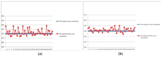 Figure 8. For the analysis of the barycenter algorithm, the experiment placed the black center point in the center of the image. The actual position coordinates in the image captured by the camera were compared with barycenter position coordinates. The experiment was repeated 50 times, and, according to