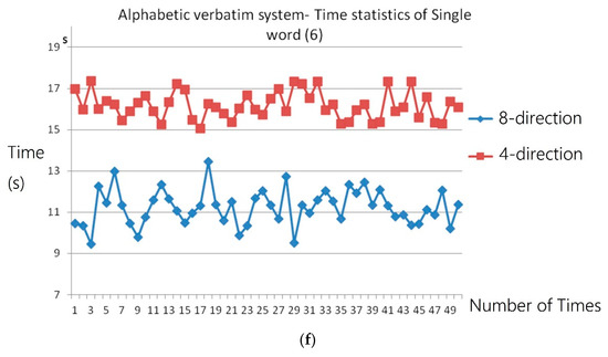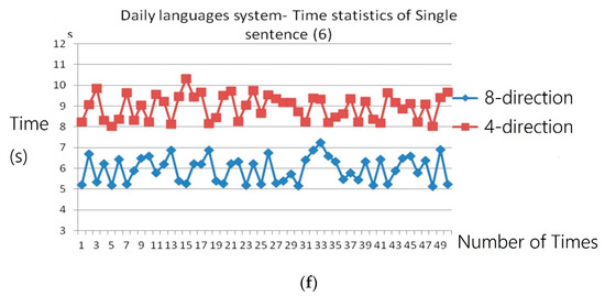 According to the experiment results, the average time for the word-by-word sound-generating system to spell a word was as follows: (1) eight directions = 11.17 ± 0.85 s; (2) four directions = 16.27 ± 0.74 s. The average time for the frequently used sentence system to finish a sentence was as follows: eight directions = 6.00 ± 0.63 s; (3) four directions = 8.86 ± 0.58 s.