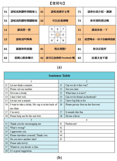 The flexible designs of frequently used (a) Chinese and (b) English sentences, and (c) English digital phonetic table of a numeric human–machine interface.