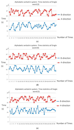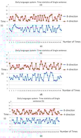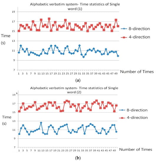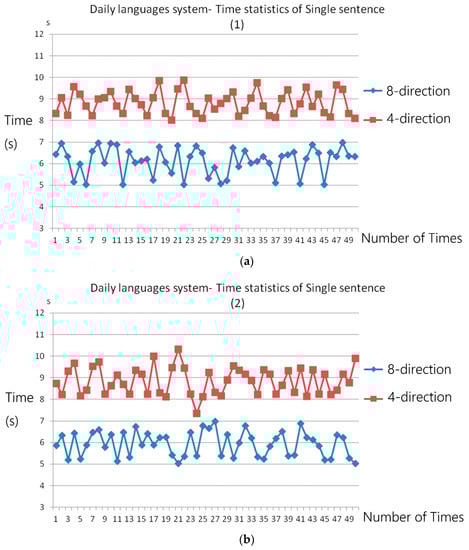 The two parts included the four-direction and eight-direction codes, respectively. Six users and their family members were invited to participate in the experiment. In the word-by-word sound-generating system, the words with three different syllables were taken as the testing words, and “Please help me.” was taken as the testing sentence for the pronunciation of frequently used sentences [20,21,22]. The experiment results showed the average time the system required to spell a word and to finish a frequently used sentence. Recording of the time started with the user’s head turn and did not stop until the system finished the coding and generated sound.