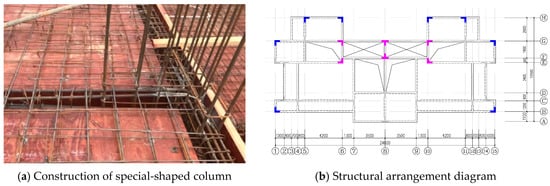 Compared with traditional rectangle columns, the special-shaped (L, T, +) columns have advantages of refraining from the wall, increasing the interior space, and improving the flexibility in the use of architectural space, due to the limb of the special-shaped column as thick as the wall. Therefore, it is favored deeply by buyers and architects [,]. Figure 1 shows practical engineering projects in which special-shaped columns have been employed.