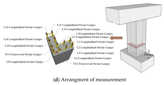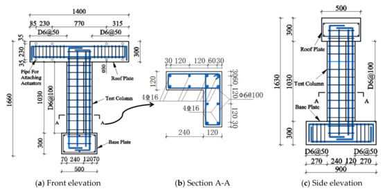 A total of six specimens with different T/M ratios (i.e., 0.00, 0.17, 0.28, 0.36) and axial compression ratios (i.e., 0.19, 0.23, 0.28) were designed for the cyclic loading test. The details for the specimens are shown in Figure 2. All specimens were identical to each other. The effective height was 1180 mm measured from the bottom of the column to the loading point. The height and thickness of the column limb were 360 and 120 mm, respectively. Both the longitudinal reinforcement and stirrup strain gauges were pasted at the middle height of the column. The concrete cover for all the specimens was 15 mm. The longitudinal reinforcement ratio and the transverse reinforcement ratio for the specimens were 1.36% and 0.94%, respectively. Longitudinal bars were 16 mm in diameter with yield strength fy = 418 MPa and ultimate strength fu = 577 MPa. Transverse reinforcement was 6 mm in diameter with yield strength fy = 340 MPa and ultimate strength fu = 472 MPa. All specimens were made of commercial concrete with the concrete strength fcu = 30.4 MPa.