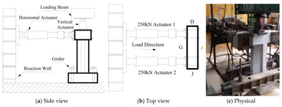 The loading principle is shown in Figure 5. The force of actuator 2 (F2) always has a constant proportion to the force of actuator 1 (F1), and the proportional coefficient is defined as α = F2/F1. Therefore, the bending moment and torsion moment at the bottom section of the specimen due to the two forces could be obtained as