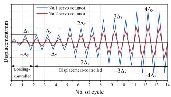 The loading process was mixed-loading patter including load-controlled pattern and displacement-controlled pattern. During the load-controlled stage, loading amplitude was conducted in single cycle. When the specimen first yielded, the loading-controlled phase was transferred into the displacement-controlled phase. The horizontal displacement corresponding to the first yield point was named yield displacement Δy, which was taken as the cyclic displacement times for loading amplitude. In the displacement controlled phase, cyclic lateral loading was quasi-statically applied to the top beam according to the displacement-controlled pattern shown in Figure 4. Each displacement amplitude was conducted in three cycles to measurement the indication of strength and stiffness degradation characteristics. The test terminated when the lateral load resistance deteriorated to 85% of the maximum measured lateral load.
