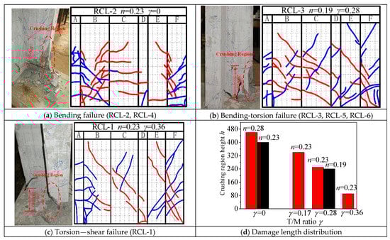 With the increase of the T/M ratio, failure modes of specimens exhibited bending failure, bending-torsion failure, and torsion-shear failure. Figure 6 shows crack patterns and failure modes for the specimens with the red cracks representing occurred when the specimen subjected the pull and blue cracks occurred when the specimen subjected the push. The L-shaped column consisted of two column limbs where one, limb B, was parallel to the loading direction. The other one, limb A, was orthogonal to the loading direction.