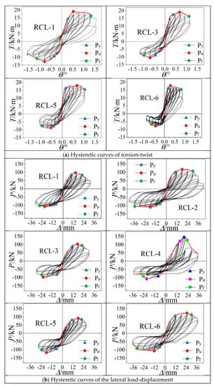 The hysteretic responses of torsion-twist and load-displacement for the specimens are shown in Figure 7a,b, respectively. The following observations could be summarized: