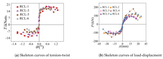 The skeleton curves of the torsion-twist and load-displacement for these specimens are depicted in Figure 8. The characteristic points (namely, the yielding lateral load Py and yielding displacement Δy, the yielding torsion Ty and yielding twist angle θy, peak later load Pm and peak displacement Δm, peak torsion Tm and peak twist angle θy, ultimate lateral load Pu and ultimate displacement Δu, ultimate torsion Tu and ultimate twist angle θu) of the specimens, which were defined on the skeleton curve, are listed in Table 2. In the following part, all the comparsion of the characteristic value from Table 2 referred to the average value.