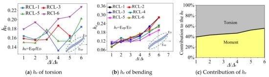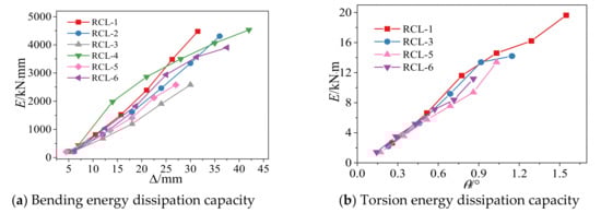 (1) From Figure 10, it is observed that the axial compression increased the bending energy dissipation significantly. At the final loading stage, the bending energy dissipation capacity of specimen RCL-4 (n = 0.28) is about 11% higher than that of specimen RCL-2 (n = 0.23), while the bending energy dissipation capacity of specimen RCL-5 (n = 0.23) is around 14.5% higher than that of specimen RCL-3 (n = 0.19). For the torsion energy dissipation capacity, with the axial compression ratio increased the torsion energy dissipation capacity declined. In the failure stage, the specimen RCL-3 (n = 0.19) resulted in a 6.1% higher energy dissipation as compared to the specimen RCL-5 (n = 0.23).