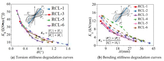 (1) Due to the formation of new cracks and yielding of reinforcements, the initial torsion stiffness degradation rate was high. Specifically, the torsion stiffness degraded by 50% when the displacement reached 3Δy. After that, the rate of torsion stiffness degradation slowed down. Comparing with the RCL-1, RCL-5, and RCL-6, the initial stiffness and stiffness degradation decreased with the increase of T/M ratio. Due to the existence of torsion, the diagonal cracks extended to the whole specimen, which led to smaller torsion stiffness.