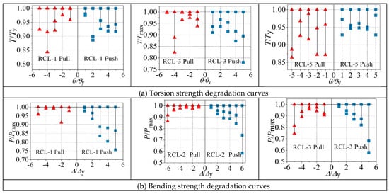 Secant stiffness (K) was used to evaluate the stiffness degradation under different displacement and twist levels, while strength degradation coefficient (λ) was used to evaluate the degree in different cycles under the same displacement and twist level. To better observe the trend of stiffness degeneration, the torsion stiffness and bending stiffness degradation curves are shown in Figure 12. The degradation curves of the torsion strength and bending strength are shown in Figure 13.