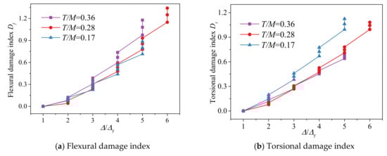 During the loading process, the torsion and flexure act together on the column. Hence, the torsional and flexural damage indices should be combined to evaluate the damage process. Accounting for the approach proposed by the Li [], the weight coefficient of T/M ratio was applied in calculating the Unified Equivalent Damage Index. The Unified Equivalent Damage Index (UEDI) was calculated by Equation (8)