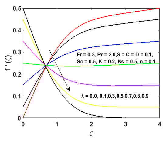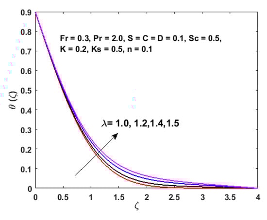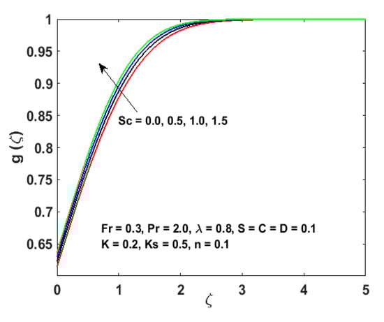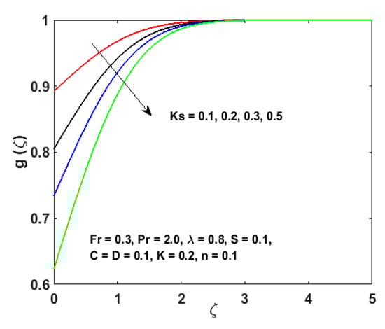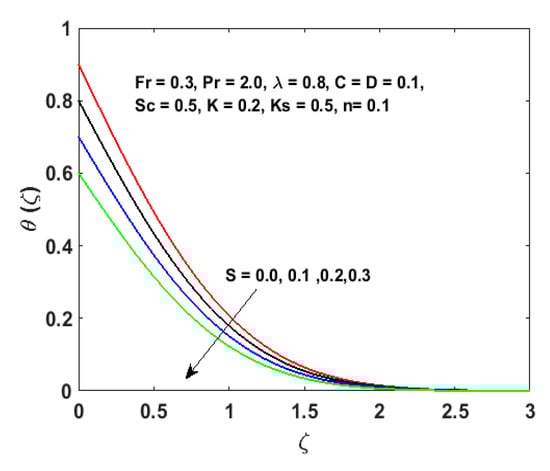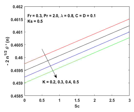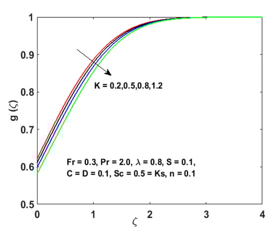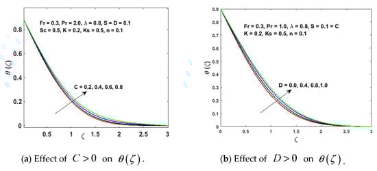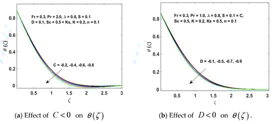 Figure 2 illustrates the performance on or the velocity ratio parameter . In our models, the velocity profile shows an increasing behavior near the surface of the needle for ; however, for , when it’s far away from the needle surface, a decreasing nature is observed. Figure 3 displays the result on for inertia coefficient . This figure illustrates that the inertial forces increase with growth in . A downfall of appears as diminution of thickness of the boundary layer for different values of that oppose the fluid motion. The influence of on is highlighted in Figure 4. An up rise for increasing values of as heat intensely intrudes inside the fluid can be seen for . Figure 5 describes the impact of the Prandtl number on . is the ratio of momentum to thermal diffusivity, so, as values of Pr increase, the momentum diffusion and thermal diffusion drop. The outcome of larger values of results in the diminution of and the thermal boundary layer. Figure 6a,b illustrates the result of non-uniform source parameter on . As corresponds to the internal heat source, an escalation can be analyzed for the strengthening the conduct of for the thermal boundary layer. Higher values of respond as heat generators, which are energy, and whose output is in the form of an increasing temperature profile . In Figure 7a,b, behave as heat sinks that are the parameters that control the flow and transfer of heat. Additionally, decreasing values act as absorbers of heat for a non-uniform heat sink. This shows a reduction in the thickness of the boundary layer, and exhibits a downfall. The response of different values of the thermal stratification parameter on the temperature profile can be noticed in Figure 8. It is noticed that the shows a deteriorating nature for larger values of due to the difference between the surface temperature and the ambient temperature. Figure 9, Figure 10 and Figure 11 provide analyses of homogeneous reaction strength , heterogeneous reaction strength , and the Schmidt number . The outcome of and on the concentration profile is shown in Figure 9 and Figure 10. As the homogeneous and heterogeneous reaction reactants are utilized such that the concentration profile decreases for higher values of and . An analysis of is shown in Figure 11 for the concentration profile of . As is the ratio of momentum diffusion to mass diffusion, higher values of boost momentum diffusivity and lower mass diffusivity. Due to this impact, escalation in the concentration profile is seen.