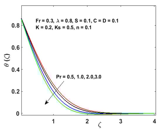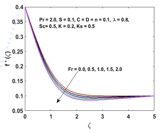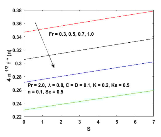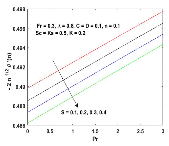 Figure 12 the drag force coefficient Cf is plotted against thermal stratification and inertia coefficient Fr. An increasing behavior of Cf is seen for higher values of . For higher values of Fr, the drag force coefficient Cf reduces. Figure 13 depicts the effect of Pr and on the heat transfer rate Nux. It is noted that Nux is an increasing function of Pr. For escalating values of , the heat transfer rate decreases. The graphical result of Nux versus for varying is shown in Figure 14. It is observed that heat transfer rate increases for higher values of , whereas Nux is a diminishing function of .