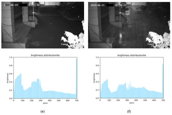Image brightness and contrast contain the information about the fog concentration during image acquisition. We set a horizontal brightness histogram: the horizontal axis represents left-to-right information of the intermediate horizontal line selected in the image, and the vertical axis represents the pixel value of each point. For example, Figure 3 shows the horizontal brightness histograms of clear daytime, foggy daytime, clear evening, foggy evening, clear midnight, and foggy midnight. Figure 3a,b corresponds to a daytime image with good air quality and a foggy daytime image. The horizontal brightness histogram y-axis absolute value of the fog-free image is larger than the foggy image. The darkness of the foggy image is higher than that of the fog-free image. Since the darkness makes high-value pixels be fewer in the images, it can be seen from the histograms of the evening images given in Figure 3c,d that the y-axis absolute value of the foggy image with poor visibility is small, and the brightness of the bright portion of the foggy image is significantly reduced while the brightness of the dark part is significantly increased. The same pattern can be seen in the midnight images shown in Figure 3e,f. Therefore, image brightness histogram analysis can be used to estimate the visibility level of the given image.