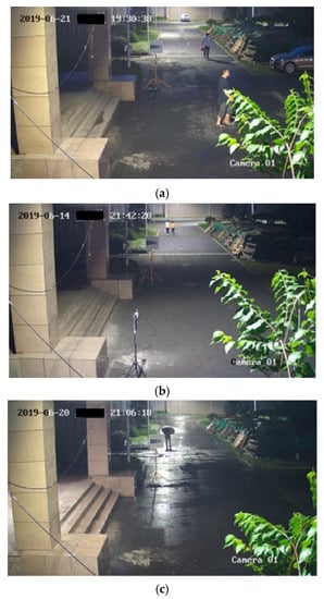 Images grabbed on the validation site with cars and pedestrians on the road. (a) cars and pedestrians; (b) pedestrians; (c) pedestrian with an umbrella.