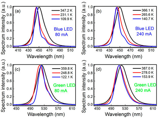 Pan, S.; Sun, C.; Zhou, Y.; Chen, W.; Zhang, R.; Zheng, Y. Investigation of the Electroluminescence Mechanism of GaN-Based Blue and Green Light-Emitting Diodes with Junction Temperature Range of 120–373 K. Appl. Sci. 2020, 10, 444. https://doi.org/10.3390/app10020444
