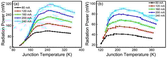 - Xi, Y.; Gessmann, T.; Xi, J.; Kim, J.K.; Shah, J.M.; Schubert, E.F.; Fischer, A.J.; Crawford, M.H.; Bogart, K.H.A.; Allerman, A.A. Junction Temperature in Ultraviolet Light-Emitting Diodes. Jpn. J. Appl. Phys. 2005, 44, 7260–7266. [Google Scholar] [CrossRef]