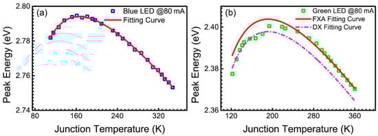 - Eliseev, P.G.; Osinski, M.; Lee, J.Y.; Sugahara, T.; Sakai, S. Band-tail model and temperature-induced blue-shift in photoluminescence spectra of InxGa1-xN grown on sapphire. J. Electron. Mater. 2000, 29, 332–341. [Google Scholar] [CrossRef]