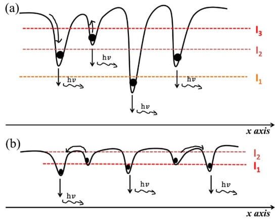 - Li, Y.; Deng, Z.; Ma, Z.; Wang, L.; Jia, H.; Wang, W.; Jiang, Y.; Chen, H. Visualizing carrier transitions between localization states in a InGaN yellow–green light-emitting-diode structure. J. Appl. Phys. 2019, 126. [Google Scholar] [CrossRef]