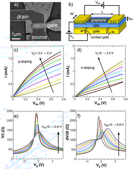 - Meric, I.; Han, M.Y.; Young, A.F.; Ozyilmaz, B.; Kim, P.; Shepard, K.L. Current saturation in zero-bandgap, top-gated graphene field-effect transistors. Nat. Nanotechnol. 2008, 3, 654–659. [Google Scholar] [CrossRef]