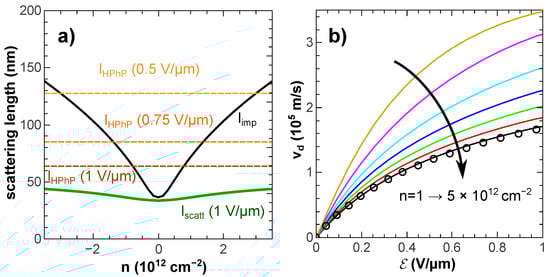 (a) Scattering length associated with the impurity scattering (black solid line) responsible for the low field mobility; here , and with the HPhP scattering (dashed lines) for different in plane electric fields . The green thick line is the total scattering length at the largest bias obtained by the Matthiessen’s law. (b) Carrier drift velocity simulated using with R from Equation (1), and the measured drift velocity at large doping () in black circles.