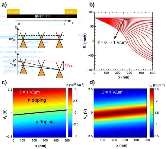 (a) Sketch of the doping profile across the graphene channel when is increased. Starting from n-doping, can be decreased down to neutrality at the drain side. This is the Dirac pinch-off. (b) Simulated along the channel for increasing in-plane electric field. (c) Color plot of the local carrier density in the channel as a function of the x-position along the channel and the gate voltage (d) Color plot of the local resistivity at V. The total resistance of the device is the integration over x of this resistivity.