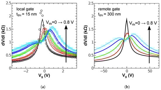 The relevant quantity for an RF transistor is the small signal resistance that we calculate from the current through the transistor and the applied bias voltage across the device. The simulated is plotted in Figure 5a where the mobility and are determined from the zero bias transfer curve and the thermal broadening coefficient (from [28]) is in principle universal. The very good agreement between measurement and simulation shows that we are able to accurately predict the behavior of a local gate transistor driven at high bias knowing the graphene mobility, the contact resistance and the substrate phonon energy. It validates our transistor model and confirms the role of the h-BN HPhPs at in velocity saturation. To emphasize the effect of the local gate on the saturation we plot in Figure 5b, a simulation for a substrate thickness of where all parameters are conserved (apart from which is adjusted to conserve the zero bias density). There is a significant difference between local and remote gate on the shape of the transfer curve. In Figure 5b, the slight asymmetry between p and n doping comes from the contact resistance difference.