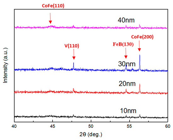 The X-ray diffraction (XRD) patterns are displayed in Figure 1. From the results in Figure 1, the Co40Fe40V10B10 demonstrated diffracted peaks in all Co40Fe40V10B10 thin films, indicating that there are distinct phases including CoFe (110) at about 2θ with 46°, V (110) at 2θ with 48°, FeB (130) at 2θ with about 54°, and the signal CoFe (200) at 2θ with 57°. The XRD intensities increased from 10 nm up to 30 nm and then drastically decreased for the 40 nm film. It can be reasonably concluded that the 40 nm is not a homogeneous and discontinuous film, thus inducing a weak crystalline peak. Apparently, a distinct high crystalline XRD peak occurred at 30 nm. According to Scherrer’s formula (1), the average grain size (D) can be estimated by measuring the full width of the half-height width (FWHM, B) of the 30-nm diffraction peak. Scherrer’s formula is [28,29],
