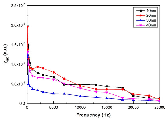 Figure 3 presents the low-frequency alternate-current magnetic susceptibility (χac) results in the CoFeVB films. When the thickness increased from 10 nm to 40 nm, χac decreased sharply with the increase in frequency. According to Equation (2) [29,32,33,34,35],