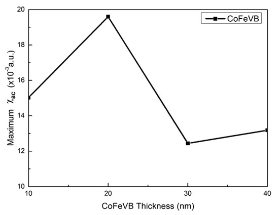 Figure 4 shows the maximum χac value associated with the thickness of the CoFeVB. For CoFeVB films with a thickness of 20 mm, the maximum χac value of 1.96 × 10−2 was obtained. When the thickness increased from 10 to 20 nm, the maximum χac was increased from 1.5 × 10−2 to 1.96× 10−2. In addition, the maximum χac decreased from 1.96 × 10−2 to 1.31 × 10−2 as the thickness ranged from 20 to 40 nm. The results show that the spin sensitivity is the strongest at the optimal resonance frequency (fres). The maximum χac at the optimal resonance frequency has the following physical significance. At low frequencies, the alternating-current dipole moment is caused by the oscillation of the volume dipole moment in each domain. The external alternating current magnetic field plays a driving role. The recovery of magnetic interaction is between domains. There is a resonance frequency as the driving force acting on the system. Therefore, the peak frequency of the low frequency susceptibility corresponds to the resonance frequency of the magnetic dipole moment oscillation in the domain. At frequency, the χac peak represents the spin exchange coupling interaction and domain dipole moment [38]. As shown in Figure 4, the best magnetic properties were achieved on the CoFeVB film with a thickness of 20 nm.