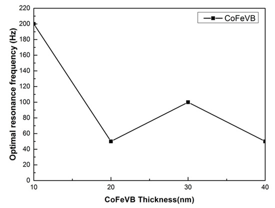The optimal resonance frequency of CoFeVB films is shown in Figure 5. According to the fres value, the maximum χac value is measured with the strongest spin sensitivity at this frequency [38,39]. The fres presented an oscillating trend with a minimum critical frequency of 50 Hz. For all CoFeVB thicknesses, the fres value of all CoFeVB thicknesses was less than 200 Hz, which indicates that the films are beneficial to the application of sensors, transformers, and magnetic recording media at low frequencies.